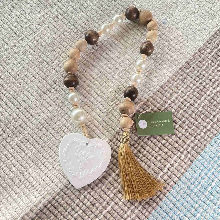Miçangas de madeira e pérolas em tons pasteis e terrosos com franja CINZA e outra ponta uma placa de metal acabamento com detalhes dourados e branco em formato de coração