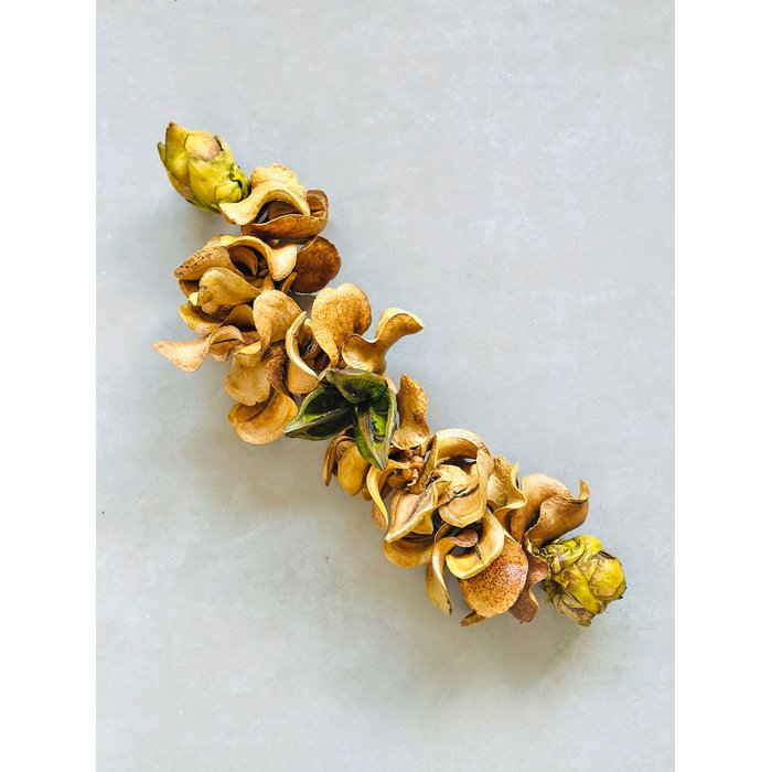 Composição: fruto do Jacarandá (Boa de Sapo) natural e Flor de Sororoca. Nas pontas, arremate com Flor de Côco.