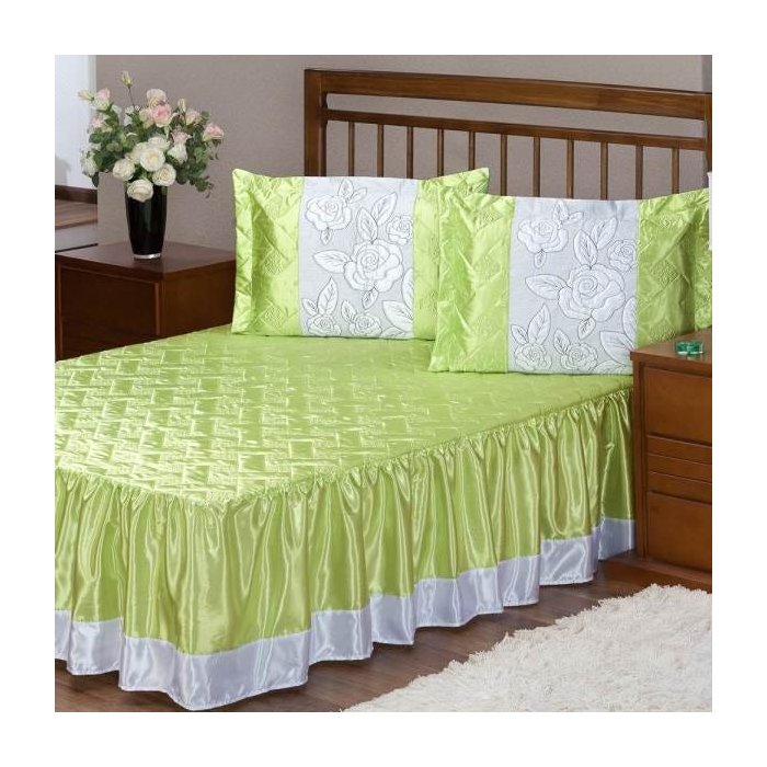 Colcha Casal Cetim com Babado Envolto 3 Peças Rosas - Verde