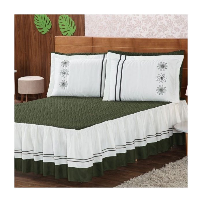 Colcha Casal Charme Floral composta por 03 Peças, confeccionado em tecido matelado e porta travesseiros bordados. Um delicado babado finaliza os detalhes desta colcha, trazendo harmonia e delicadeza ao enxoval do quarto.
