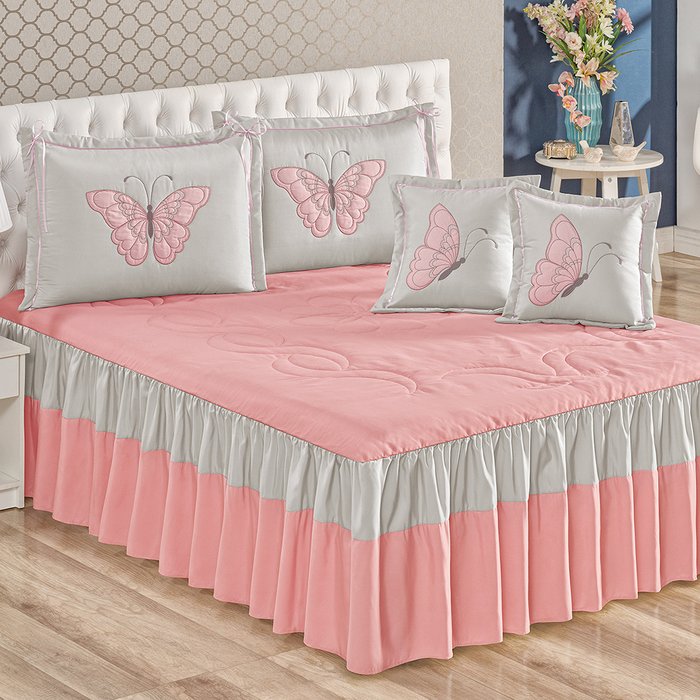Colcha Casal Detalhe Bordado Liberty 7 Peças Rosê e Cinza