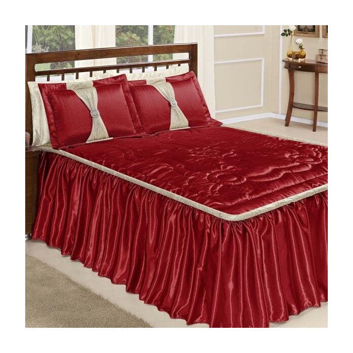 Colcha Casal Padrão Melissa Seda Brilhante com Babado 5 Peças - Vermelho