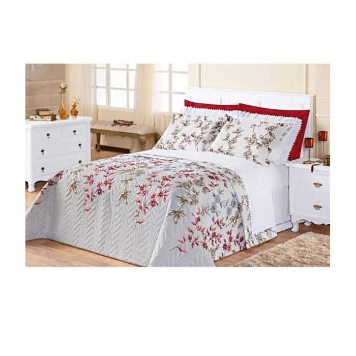 Conteúdo da embalagem e medidas: Cobre Leito 2,40m x 2,10m 02 Porta Travesseiros 70cm x 50cm Composição: Tecido: 60% Algodão / 40% Poliéster Enchimento: 100% Poliéster