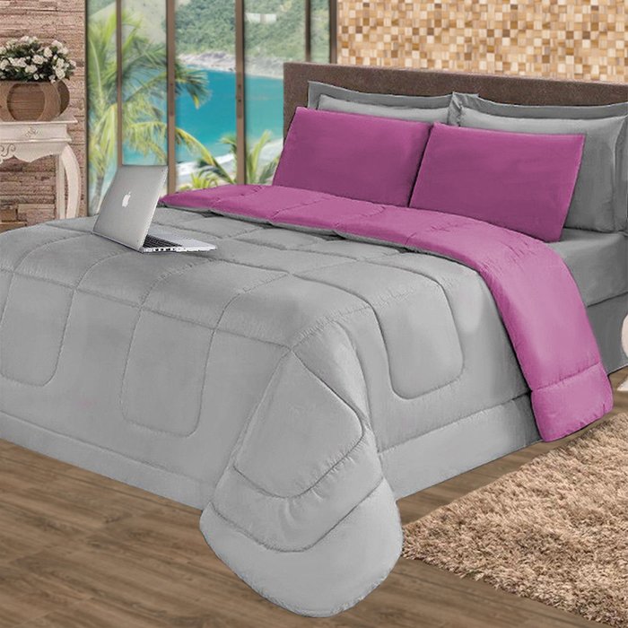 Colcha Dupla Face 5 pçs de Verão Casal Queen Cinza e Rosa Cotex