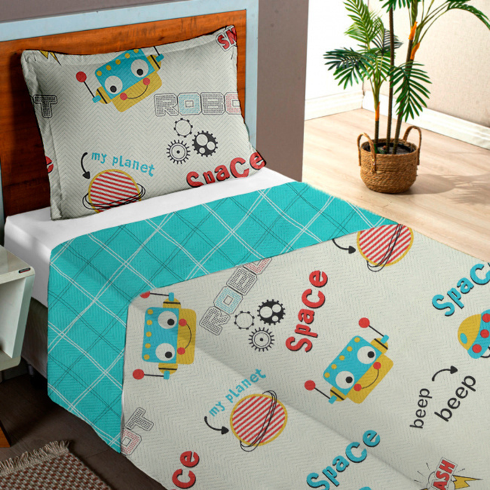 Colcha Infantil Solteiro Dupla Face Menino e Menina Robô