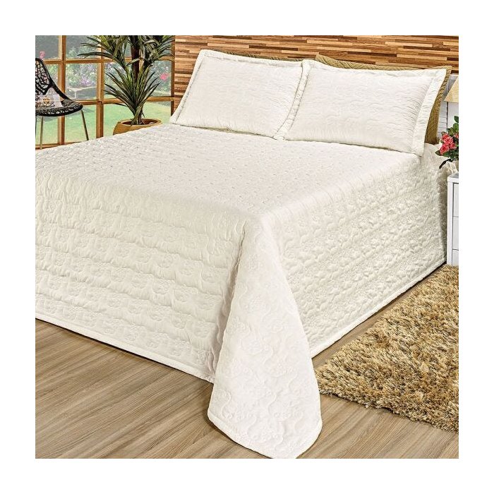 Conteúdo da Embalagem: 01 Cobre Leito 2,75m x 2,60m, 02 Porta Travesseiros 80cm x 55cm (medida útil 70cm x 50cm). Composição: Tecido Superior: 100% Poliéster. Tecido Inferior: 67% Poliéster / 33% Algodão. Enchimento: 100% Poliéster. Cor: Palha.