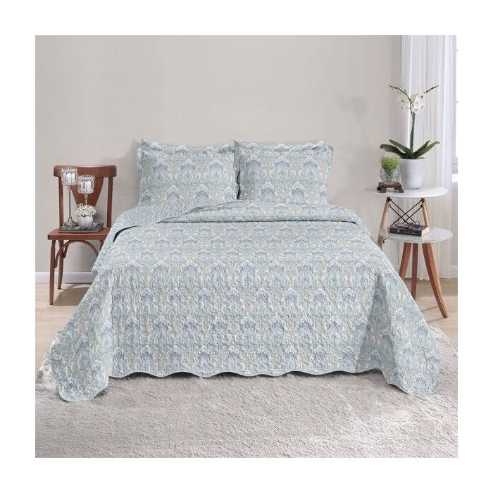 Com nuances delicadas de verde e azul, que se mesclam perfeitamente na estampa encantadora, o Kit Colcha Arabesque conta com acabamento em viés, detalhe micromatelassê, frame e porta-travesseiro com 03 abas. Tudo isso coloca ainda mais charme na composição da sua cama.