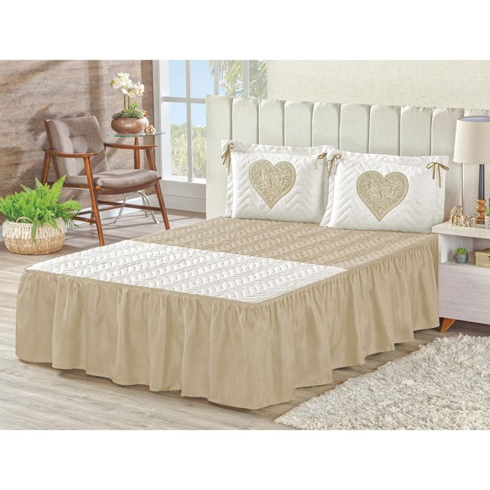 Colcha Queen 5 Peças com Babado Bordada Coração Heart:Cáqui Cáqui