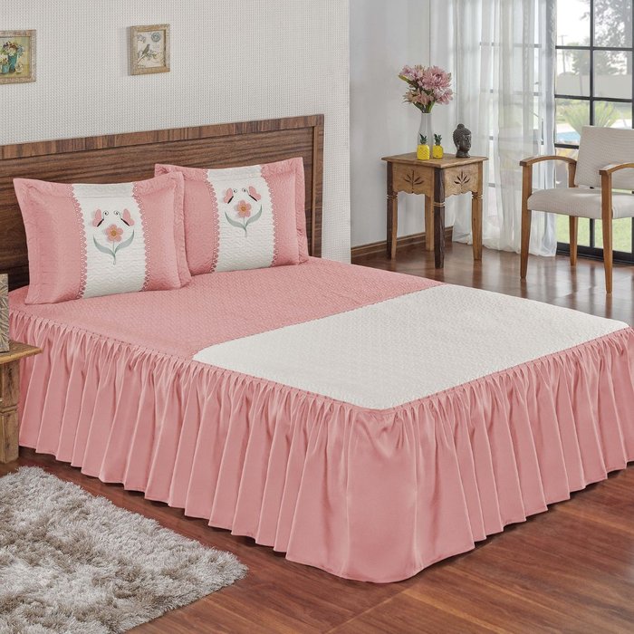 Colcha Queen 5 Peças com Babado Bordada Juliana:Rose Rose