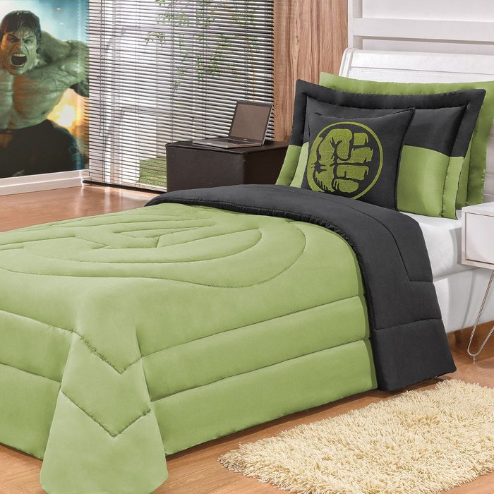 Design exclusivo: As cores vibrantes, o símbolo do Hulk em alto relevo e os detalhes exclusivos deixam o quarto com um visual moderno e cheio de personalidade.