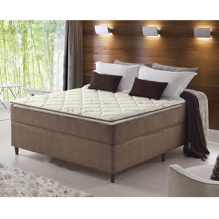 O revestimento do tampo é em poliéster, seu entrelaçamento dá resistência e durabilidade ao colchão, com toque agradável, o que garante muito mais conforto. O bordado contínuo deixa o colchão mais vistoso e bonito. As laterais são em jacquard marrom, que deixa o seu colchão muito mais bonito.
