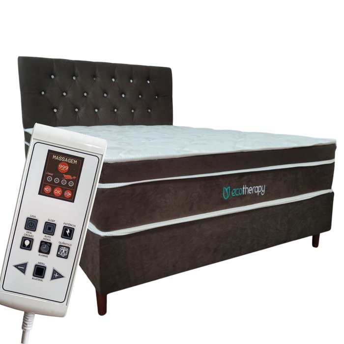 Colchão magnético vibro massagem + base padrão + cabeceira Colchão possui densidade 33 onde suporta até 300 kg sem deformar o colchão. Com revestimento em tecido sued onde trás uma sofisticação ao produto, utilizando também um tampo com tecido Jacquart onde trata maior durabilidade ao colchão. Com um ciclo de massagens de 1.000 funções diferentes, onde consegue fazer a configuração conforme sua necessidade. Possui cromoterapia, bioquântico, despertador, controle digital, seleção de lados ( esquerdo e direito).Garantia de 15 anos para estrutura do colchão e 3 anos de parte elétrica. VEM INCLUSO BASE BOX PADRÃO + CABECEIRA PAINEL. <br><br>