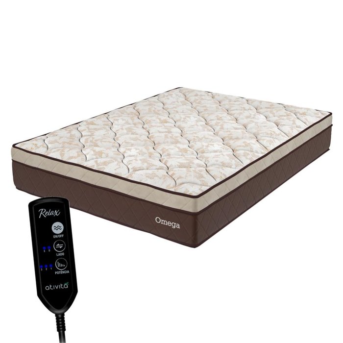 O Colchão Omega com massageador garante excelentes noites de sono! Sua função massageador, auxilia no processo de relaxamento muscular, induzindo ao sono profundo e reparador, melhorando a circulação sanguínea e aumentando a oxigenação e nutrição das células, acompanha controle vibro massagem até 3 potências. Para uma noite de sono mais tranquila e relaxante, opte pelo Colchão Omega, garantia de total descanso, e qualidade de vida! Produzido com materiais de alta qualidade, tecido veludinho, tampo macio com matelassê em malha, e preenchimento com espuma D28. / MODELO: Colchão Magnetico Casal Massageador / MARCA: Viero / MEDIDAS: A = 26 cm L = 138 cm P = 188 cm / COR: Marrom / MATERIAL: Colchão com EPS, espuma D28, manta perfilada e massageador / ACABAMENTO: Tampo em malha, laterais tecido veludo / DIFERENCIAL: Colchão acompanha controle vibro massagem até 3 potências / NIVEL DE CONFORTO: Extra – Firme / PESO: 28,80 Kg / PESO SUPORTADO: 120 Kg / INSTRUÇÕES / CUIDADOS: Utilizar em local seco com passagem de ar / ITENS INCLUSOS: 1 colchão e 1 controle / GARANTIA: 12 Meses pelo Fabricante (Tecido 3 meses) / Montagem não inclusa. Entregamos até a porta de entrada da casa do cliente ou até a portaria do condomínio.