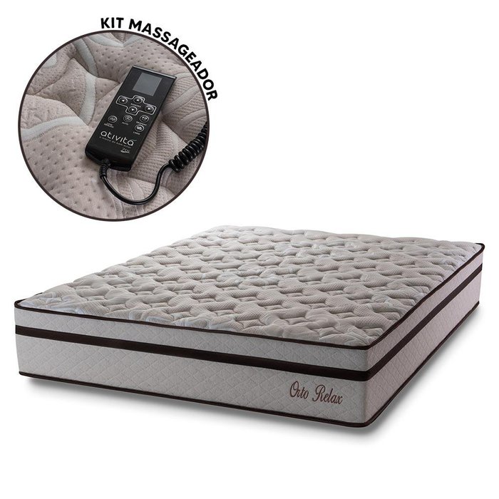Dimensões do Produto: Largura 158cm; Profundidade 198cm; Altura 33cm.Itens Inclusos: 1 colchão queen size. Durante o sono, nós recarregamos nossas energias para começar um novo dia. Se você tem dificuldade em achar uma posição confortável para dormir ou se acorda com dores no corpo, se sentindo cansado, é sinal que tem algo errado.Uma noite de sono tranquila é essencial para o bom funcionamento do nosso corpo e da nossa mente, resultando em melhor qualidade de vida e sabemos que isso não tem preço!O colchão magnético Orto Relax é capaz de proporcionar a você uma noite revigorante pois possui uma combinação de espumas ortopédicas, pastilhas magnéticas, infravermelho e motores de massagem com controle para que você escolha o modo mais confortável.Invista agora em seu novo colchão magnético massageador e passe a ter mais qualidade de vida! Benefícios do Colchão Magnético Orto Relax Com Massageador- Ajuda melhorar a circulação sanguínea- Ajuda melhorar dores nos ombros, nuca e costas- Ajuda eliminar a energia estática- Ajuda a combater insônia- Ajuda diminuir a tensão nervosa, alterações digestivas e neurológicas- Auxilia no relaxamento muscular- Possui imãs de ferrite com energia magnética que ajuda a prevenir dores musculares, estabiliza o metabolismo e aumenta a sensação de relaxamento através do sistema de VIBRO-TERAPIA que possui 8 pontos de relaxamento. Especificações do Colchão- Tampo em malha matelassê (costuras)- Manta em poliéster abaixo do tampo- Lateral em tecido jacquard- Kit massageador com controle- Fina camada de espuma D20 para garantir maior maciez- Camada de espuma perfilada High Tech- Espuma D33 (Densidade 33)- Placa de EPS (material tecnológico leve e moderno)- Fundo revestido com espuma D20 e tecido planoComplexidade da montagem: Não necessita montagem.Recomendações de uso, manutenção e limpeza: Limpar com flanela ou pano macio seco, não utilizar produtos abrasivos, desengordurantes, álcool ou solvente. Não expor o produto diretamente a luz solar e à umidadeGarantia: 3 mesesOBS: Foto meramente ilustrativa, objetos, utensílios e decoração não fazem parte do produto.