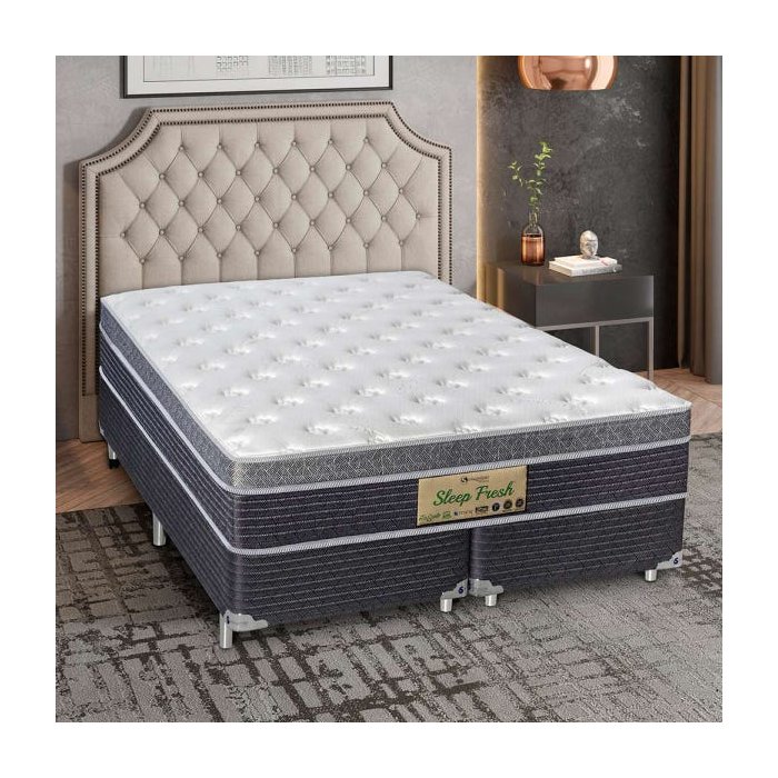 Box não incluso; tampo bordado com tecido tencel (esse tipo de tecido é especialmente indicado para pessoas com problemas de pele, devido ao grande volume do fio, o que aumenta ainda mais a sensação de maciez. Esse tipo de tecido é muito usado nas indústrias de lingerie e de roupas para bebês; molas ensacadas individualmente, com fio de aço 2.0 Tiupo 2x (duplo action)