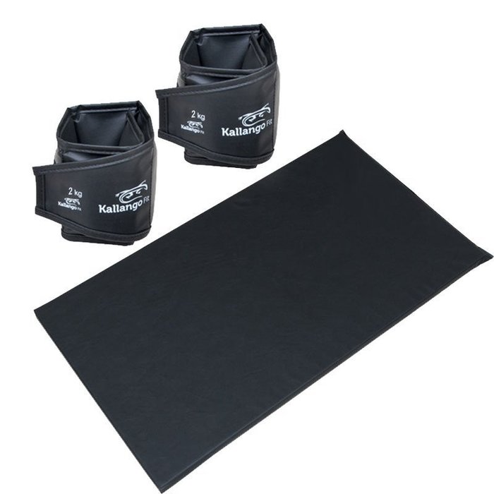 Kit completo para você se exercitar em casa ou na academia, contém um colchonete e um par de caneleiras de peso para perna de 2kg cada, ideal para exercícios em solo e muito usado em aulas de ginástica.