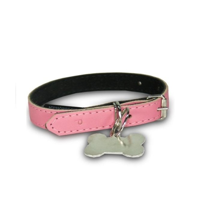 Coleira Couro Cachorro Pingente Ossinho Metal Rosa - P