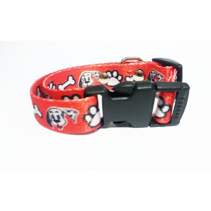 Linda coleira para o seu Pet. Muito confortável e moderna, estampada na cor Vermelha com desenho de cachorrinhos e patinhas.