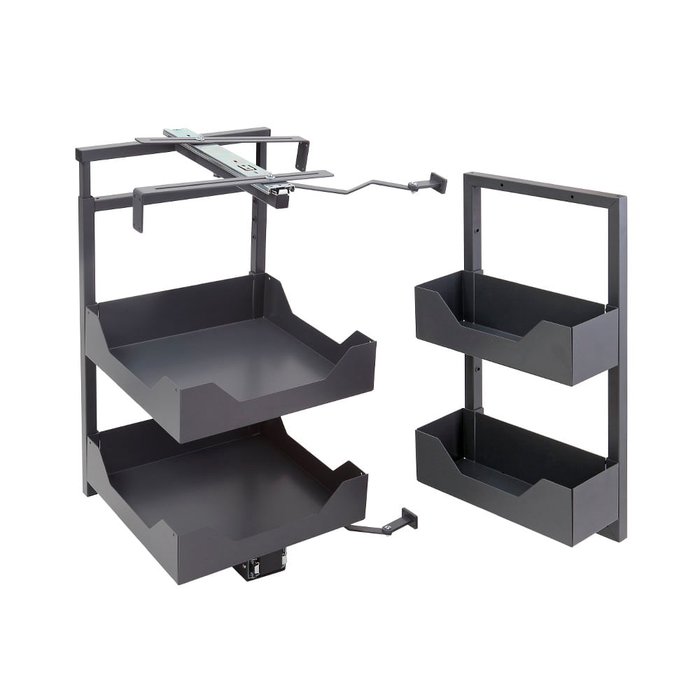 A coluna baixa com 2 bandejas está disponível em duas versões de tamanhos das bandejas para que seja utilizada para acomodar inúmeros utensílios como: pratos, panelas e eletrodomésticos. Deixe a criatividade fluir e inclua a coluna baixa em outros ambientes além da cozinha. A coluna é fixada dentro do móvel e o braço articulador fixado na porta, fazendo assim o movimento que torna extremamente fácil a acessibilidade ao produto. Ainda, se preferir, adicione os divisores de bandeja para acomodar de forma segura os produtos na bandeja.