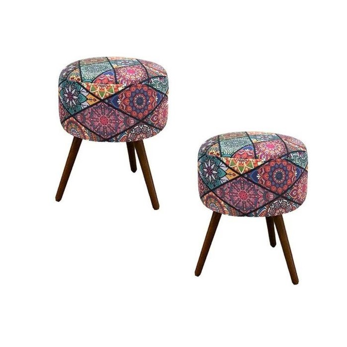 Combo 02 Puffs Banqueta Redonda Suede Estampado Mandala Preto - DS Estofados