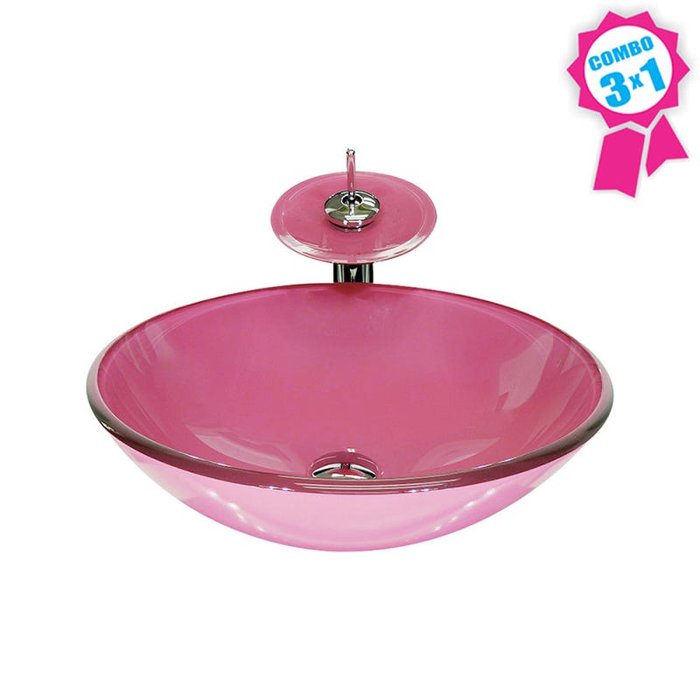 Combo 3 em 1 - Cuba de Vidro Redonda 31cm Florença + Torneira Ibiza + Válvula Beirute Rosa