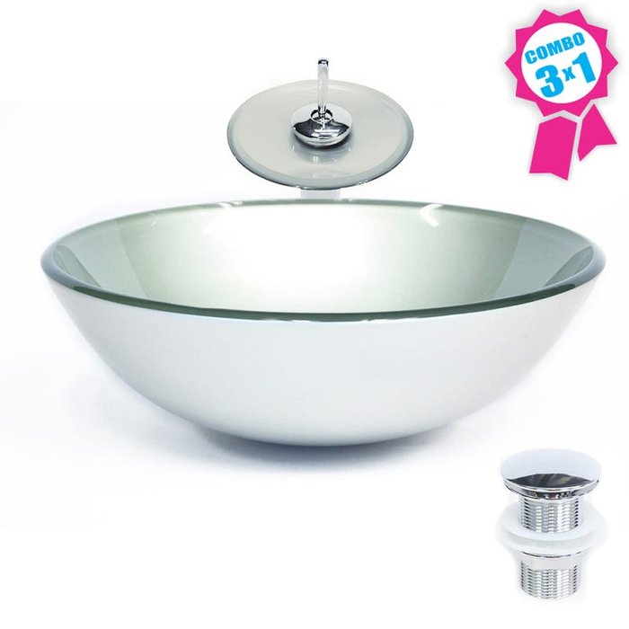 Combo 3 em 1 - Cuba de Vidro Redonda 42cm Milão + Torneira Ibiza + Válvula Beirute Prata