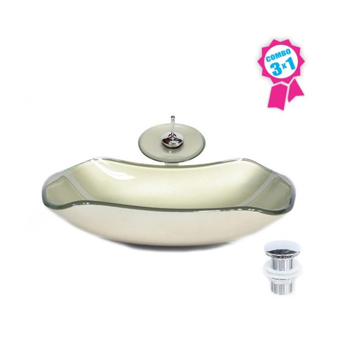 Combo 3 em 1 -cuba de Vidro Retangular Abaulada 51cm Parma + Torneira Ibiza + Válvula Beirute Champa