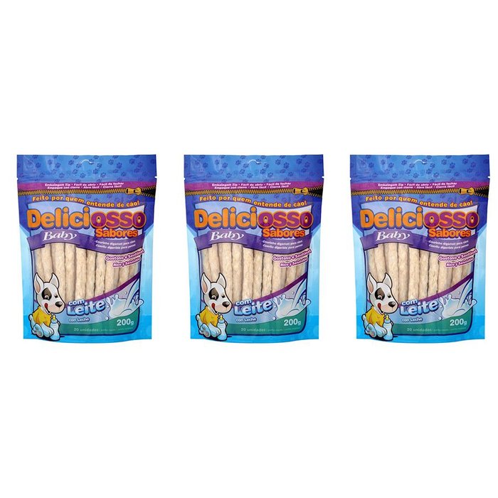 Combo de Ossinhos Para Cães Filhotes: 3 Pacotes Osso Palito Baby Leite Deliciosso 200g