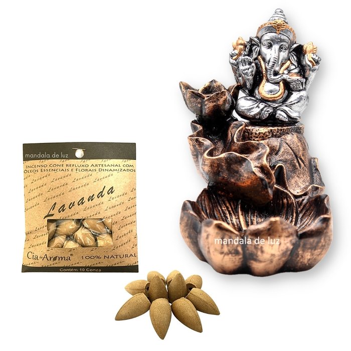 Combo Incensário Cascata Ganesha 14 cm + Incenso Cone Lavanda Natural