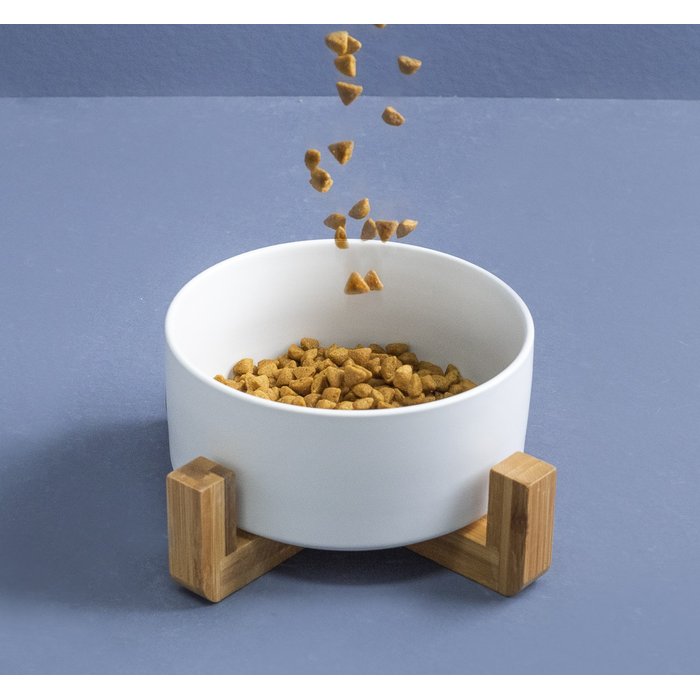 COMEDOURO E BEBEDOURO DE CERÂMICA COM BASE DE BAMBU PARA PET BRANCO