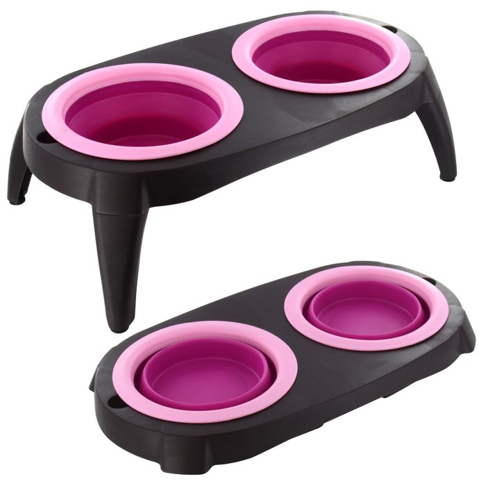 Conjunto de jantar completo. Este design de tigelas duplas para cães oferece uma refeição completa com comida e água ou alimentação de 2 filhotes ao mesmo tempo. A tigela de silicone pode ser dobrada para ajustar o volume de acordo com a ingestão de alimentos do seu animal de estimação, cerca de 275-440ml para água, 265-710ml para alimentos (9-24oz).