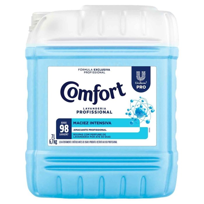 A fórmula do Amaciante Comfort Pro Lavanderia Profissional foi desenvolvida para assegurar maciez e aroma às roupas e tecidos, com alto nível de ingredientes suavizantes que penetram nas fibras das roupas. Com a qualidade de Comfort, o formato Profissional trata as roupas a cada ciclo de lavagem, proporcionando maciez prolongada e aroma duradouro. Inclui tecnologia que ajuda a proteger as peças contra os sinais de envelhecimento dos tecidos: previne a formação de bolinhas, mantém a elasticidade, previne danos, evita esgarçamento, protege as cores e mantém o brilho das roupas. A embalagem de 7 litros rende até 700 quilos de roupas macias e tratadas. É um produto mais sustentável, com embalagem reciclável e ingrediente ativo biodegradável.
