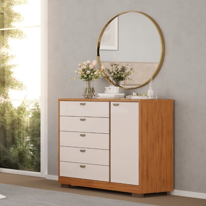 Cômoda 1 Porta 5 Gavetas Ferrara Cor Freijo Off White - Dj Moveis Dj Móveis