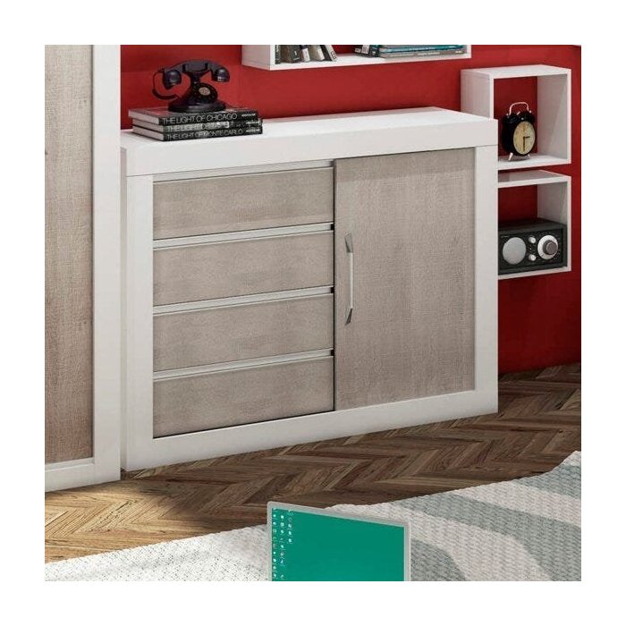 Cômoda com 4 gavetas e uma porta de correr. Fabricada em mdp bp branco 15 mm (nas laterais e prateleiras), acabamento lacca nas portas e frentes de gaveta BP. Gavetas com corrediça telescópica. Trilho de alumínio na porta.