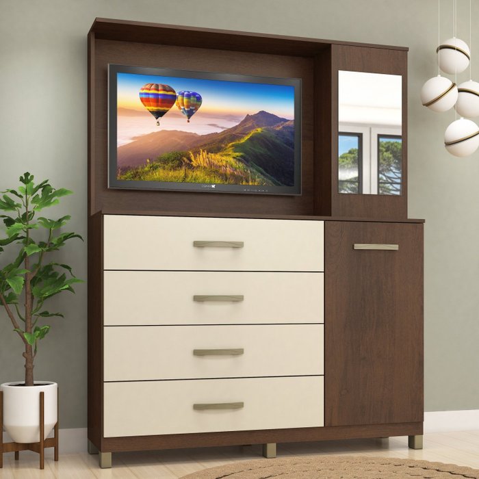 Cômoda 2 Portas 4 Gavetas com Espelho, Painel TV até 43 Polegadas e Pés Denver