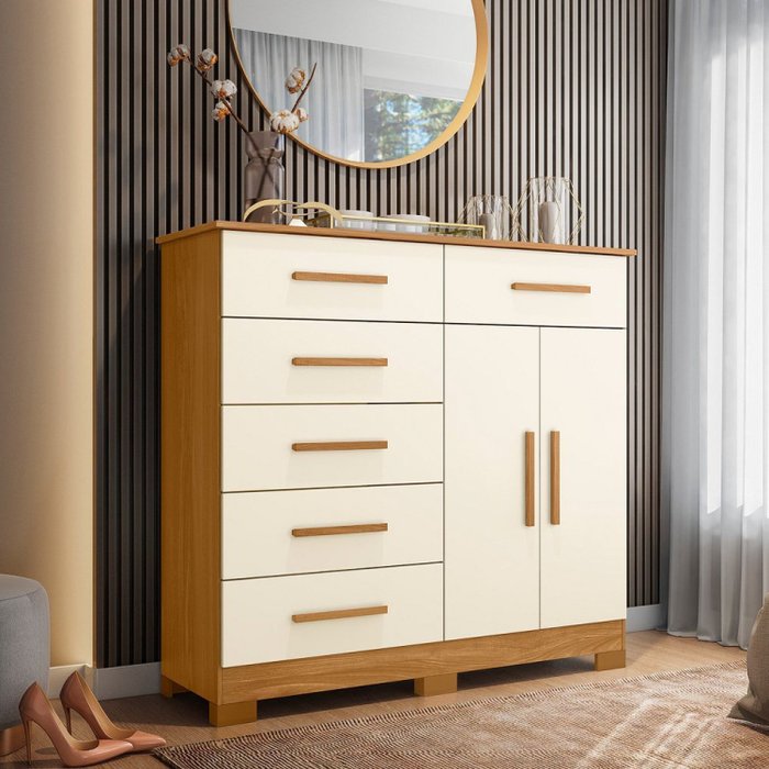 A Cômoda New Xangai além de linda, é robusta e possui espaços funcionais. Sua composição conta com 6 gavetas se 2 portas com prateleiras. Seus puxadores em MDF revestidos, são mais resistentes e charmosos.
