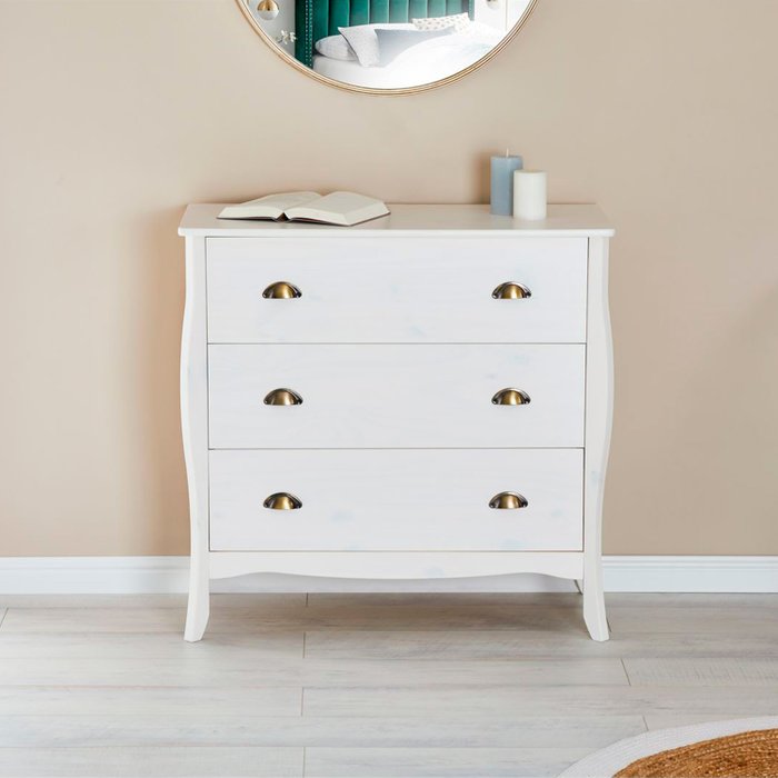 Caracterizado por seu estilo Barroco criado nas primeiras décadas do século XVIII, a Cômoda 3 Gavetas Antoinette é um produto bem distribuído, assim, suporta organizar suas roupas de maneira eficaz. Possuindo design nas laterais e em seus pés em formas curvas agregando muita beleza para seu quarto ou sala de jantar. A Cômoda 3 Gavetas Antoinette é um produto versátil sendo capaz de compor sua sala ou quarto. Nossos produtos são de madeira de pinus maciço reflorestada assim cuidamos do meio ambiente. Pensamos também na saúde de sua família utilizando pinturas livre de solventes e sem formaldeído.