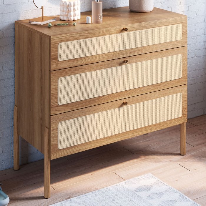 Cômoda 3 Gavetas Palhinha Pé Madeira 27934 Oslo Artesano - Hanover/pé Roble Bege