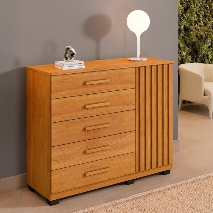 A Cômoda Paris é um móvel de alta qualidade, produzido em chapa de 15mm que garante robustez e uma vida útil prolongada. Com um design elegante, ela conta com 1 porta ripada, 2 prateleiras espaçosas e 5 gavetas grandes, todas equipadas com corrediças telescópicas para um deslizamento suave. Além disso, os pés estão inclusos no produto, proporcionando estabilidade e segurança. Os puxadores na cor complementam o visual sofisticado do móvel. Com a Cômoda Paris, você tem um excelente custo-benefício, unindo qualidade, funcionalidade e estilo em um só produto.