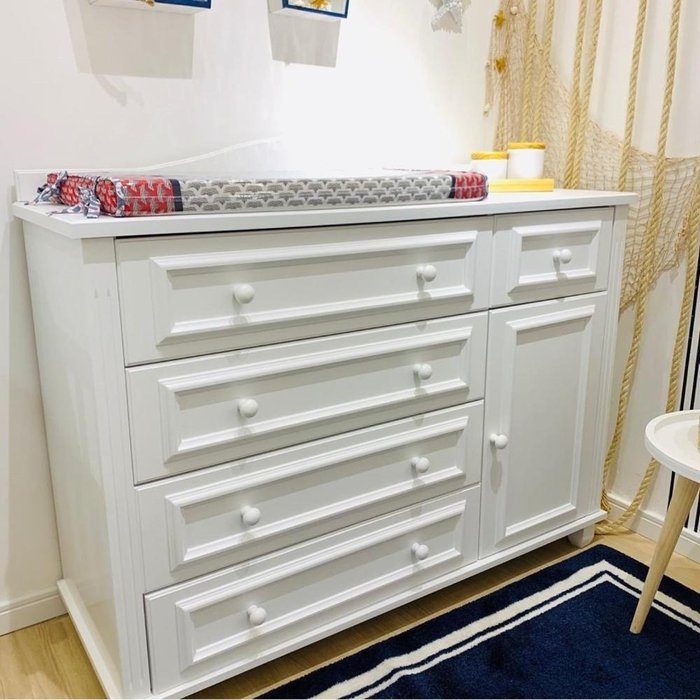 Cômoda 5 Gavetas 1 Porta Provençal Paris Branco. Cômoda Paris, com design provençal clássico, detalhes em alto e baixo relevo e puxadores pontuais em madeira. Cômoda grande com 4 gavetas, 1 gavetinha e 1 porta. Excelente espaço para armazenar e organizar as roupas do bebê, porta com prateleira. Parafacilitar o cotidiano o tampo pode ser utilizado como trocador para o bebê.