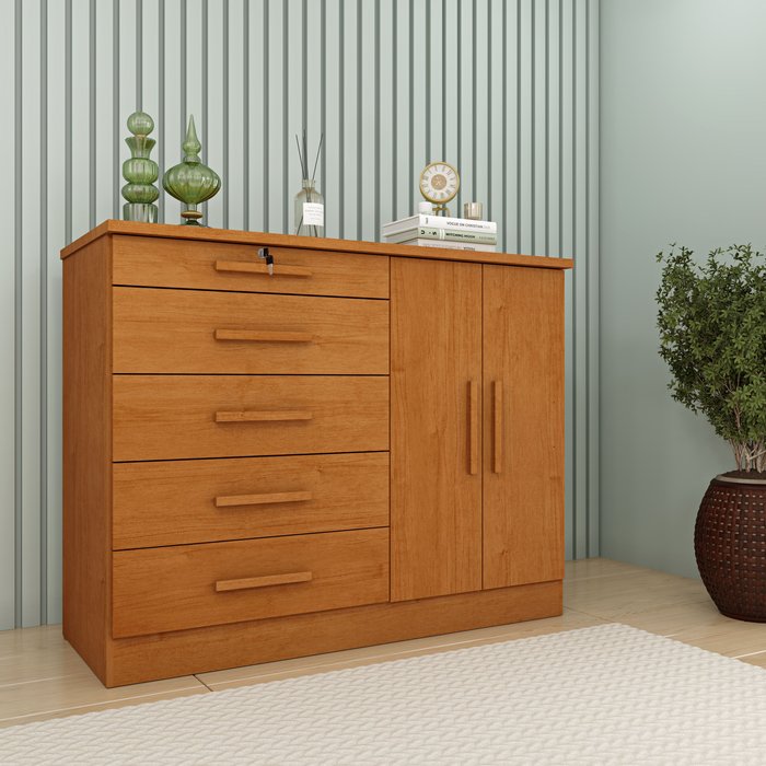 Invista na Cômoda 5 Gavetas 2 Portas 136cm Istambul e leve para sua casa uma peça que combina beleza, funcionalidade e a segurança que seu quarto merece!