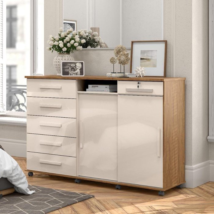 Cômoda Balcão 2 Portas 6 Gavetas Organizador Sala De Estar Quarto Home Office Off White Marrom