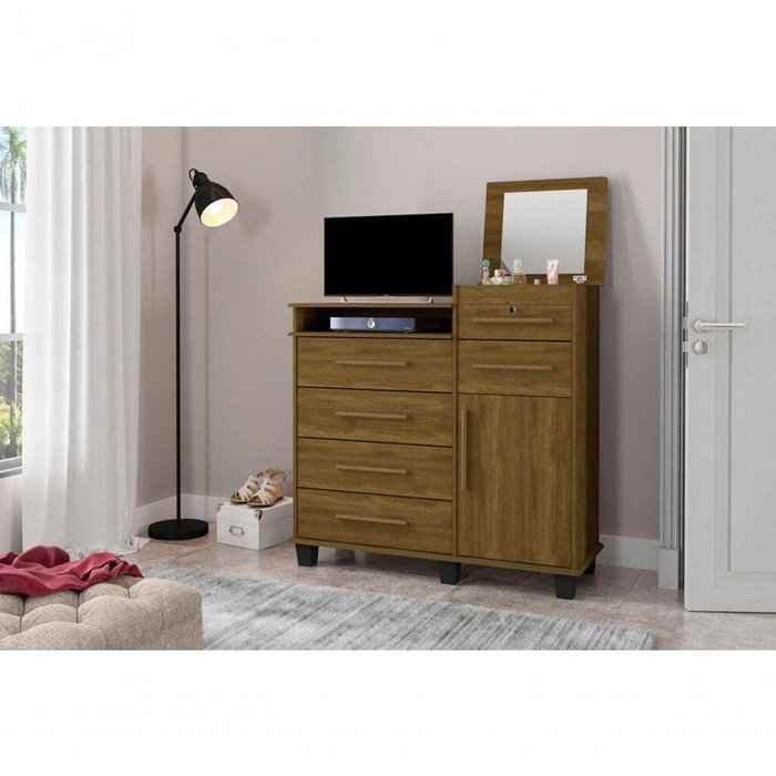 A Cômoda Brilhante é uma cômoda surpreendente! É inteligente, porque possui 5 gavetas normais, 1 gaveta com chave, sapateira, nicho, porta acessórios e espelho, que possibilitam a acomodação de roupas, sapatos e até jóias, além de vídeo games, DVDs e até TVs.É funcional, porque é muito bem dividida, aproveita muito bem os espaços, e facilita muito a limpeza. E é charmosa, porque seu espelho reclinável dá a impressão de penteadeira, e porque tem compartimentos que guardam seus objetos, enquanto tem outros que mostram.Medidas:Altura: 113 cm