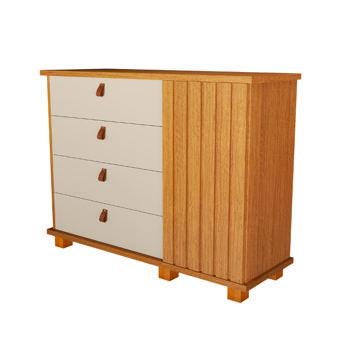 A Cômoda com 4 gavetas e 1 porta ripada é a combinação perfeita de elegância e funcionalidade. Com puxadores de couro e pés de madeira, possibilita um toque moderno e sofisticado ao quarto. Oferece amplo espaço interno para organizar roupas e acessórios, garantindo beleza e praticidade ao ambiente.