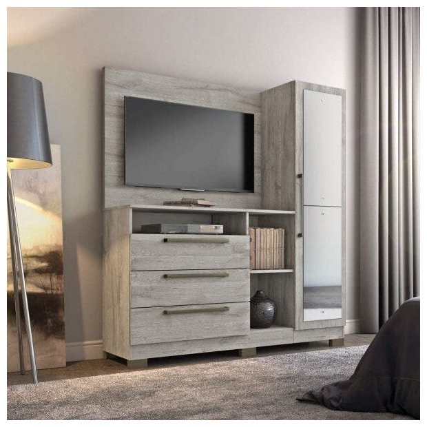 Essa cômoda possui 3 gavetas grandes, contendo corrediça telescópica, três prateleiras internas, possui 6 pesinhos para melhor estabilidade do produto e facilita na hora da limpeza, espaço para TV de até 48 polegadas, possui também um excelente espaço para distribuição de decoração e além disso é um excelente produto principalmente para o quarto, pois ajuda e muito no ganho de espaço.