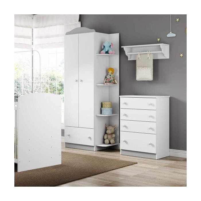 Quartinho infantil é um ambiente de muitas emoções, e deve ser também de festa. Por isso, a Multimóveis criou a Linha Confete Plus. Uma das peças essenciais para o quartinho do bebê é a cômoda que nessa linha vem com 4 gavetas mistas com puxadores decorativos, na cor branco premium com opção de escolha de rodapé nas cores Branco, Rosa, Azul e Cinza, pode ser adequado tanto para meninos quanto para meninas. Fabricado em madeira 100% MDP. Prática e funcional é o que faltava no quarto do bebê para manter tudo em ordem e organizado.
