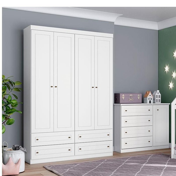 Cômoda e Guarda Roupa Infantil Americano 4 Portas Branco HP - Henn