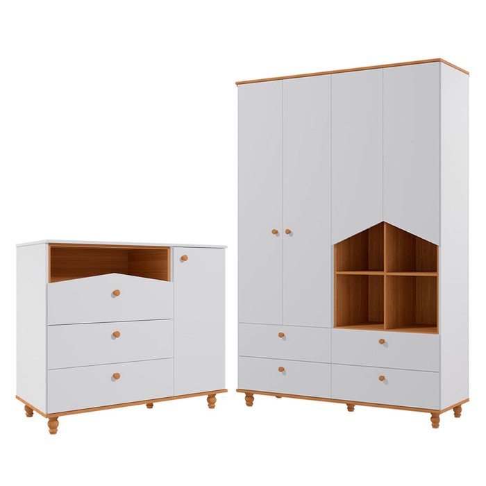 Cômoda e Guarda Roupa Infantil Casinha 4 Portas Permóbili Baby Branco/nature 100% Mdf Comoda Casinha Branco/Nature
