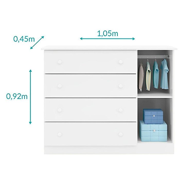 Cômoda E Guarda Roupa Infantil Leonardo Branco Brilho - Phoenix Baby O Roupeiro e Cômoda Leonardo são perfeitos para você que busca qualidade e modernidade para complementar o quarto do seu filho (a). Produzidos em MDP chapa de 12mm e 15mm, acabamento em pintura branco UV alto brilho atóxica. O Roupeiro possui 04 portas e 02 gavetas com corrediças telescópicas com divisórias internas bem elaboradas e amplo espaço interno de armazenamento para roupas, sapatos e acessórios, e com puxadores em formato bolinha. A Cômoda possui 01 porta com cabideiro, prateleira interna e 04 gavetas com corrediças telescópicas, e puxadores em formato bolinha, uma ótima divisão e muito espaço interno. Seu design moderno e aspecto clean são perfeitos para completar o quarto do seu filho (a).