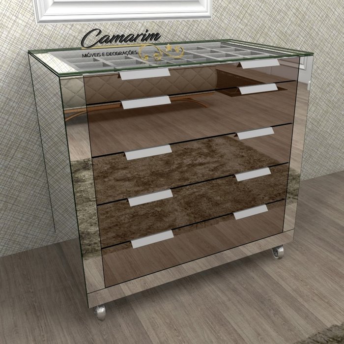 Cômoda Espelhada Moderna c/ Portajoia Tampo de Vidro e interior Branco FRENTE ESPELHO BRONZE